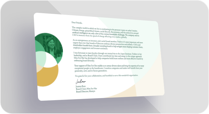 Dear Friends, The complex world in which we live is unrelenting in the pressure it puts on today’s leaders. Climate change, geopolitical threats, social discord, the economy, and the unknowns around arti昀椀cial intelligence are only a few of the current formidable challenges. No company and no CEO is immune from the speed of change a昀昀ecting every market, globally. As an entrepreneur, an investor, and a serial board member, I believe it’s more important and more urgent than ever that boards of directors embrace diverse perspectives and skillsets. CEOs and shareholders bene昀椀t from a broader sounding board to help navigate issues shaping customer choice, employee engagement and investor sentiment. I was fortunate to meet Jocelyn through our mutual ties to the Aspen Institute. I believe in her leadership, and as Board Chair, I have contributed my time and energy to the unique approach Him For Her has developed to help companies build more resilient and more e昀昀ective boards by embracing board diversity. Your support of Him For Her enables us to attract diverse talent and bring the expertise of so many exceptional people to the boardroom. Countless companies and leaders will bene昀椀t from your generosity, now, and in future generations. I’m grateful for your collaboration, and humbled to serve this wonderful organization. Joanna Rees Board Chair, Him For Her Board Director, illumyn